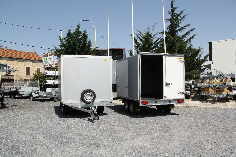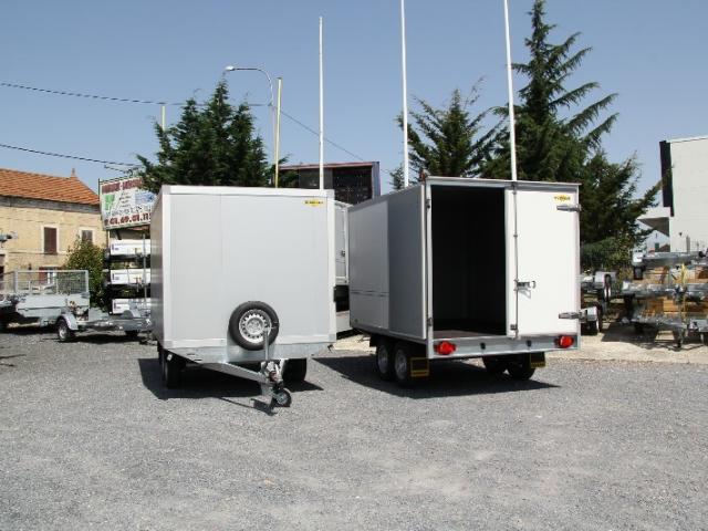 Remorque fermée 2 essieux roues dessous, freinés, parois panneaux sandwich 45 mm.