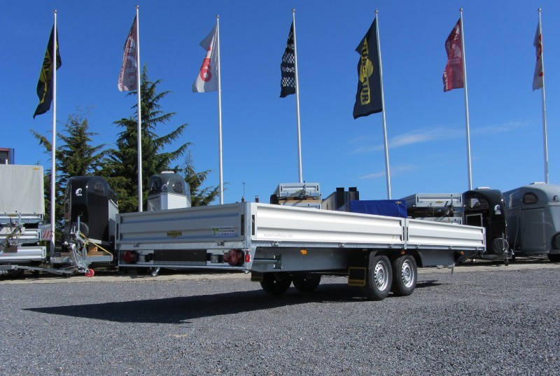 Professionnels ou particuliers, vous recherchez une remorque plateau 2 essieux, roues dessous, ridelles alu pour vos transports de matériaux ou de véhicules.